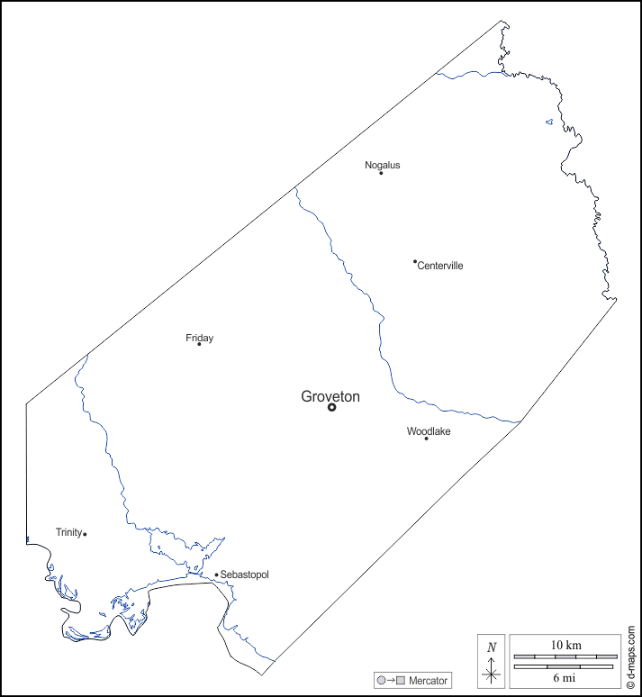 Centerville, Friday, Groveton, Nogalus, Sebastopol, Trinity, Woodlake.