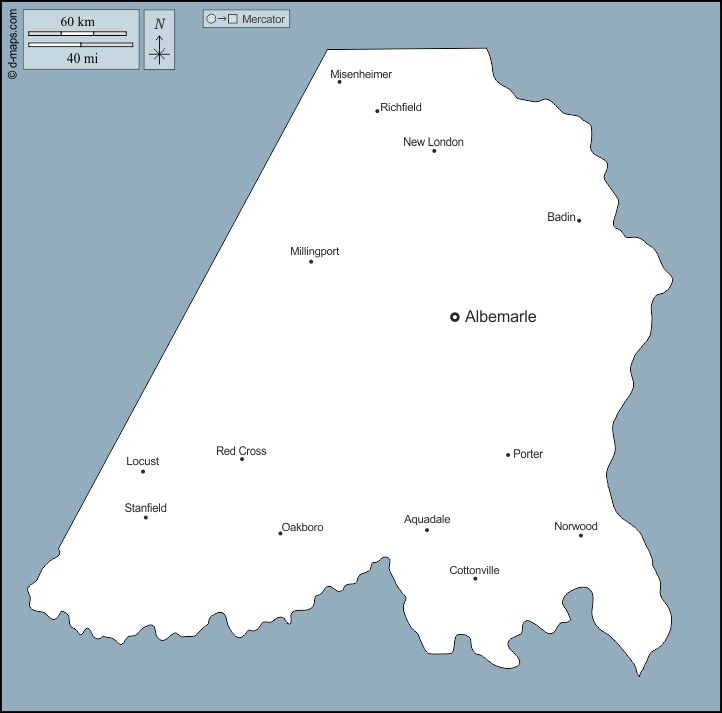 Albemarle - Aquadale - Badin - Cottonville - Locust - Millingport - Misenheimer - New London - Norwood - Oakboro - Porter - Red Cross - Richfield - Stanfield