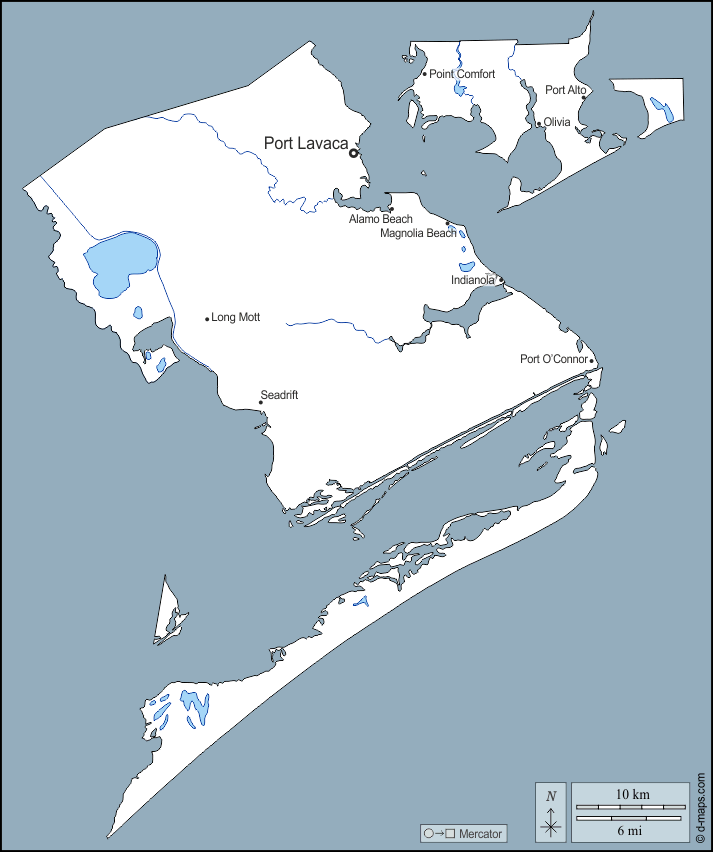 Alamo Beach, Indianola, Long Mott, Magnolia Beach, Olivia, Point Comfort, Port Alto, Port Lavaca, Port O’Connor, Seadrift.