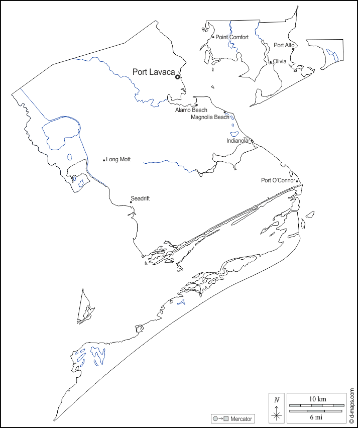 Alamo Beach, Indianola, Long Mott, Magnolia Beach, Olivia, Point Comfort, Port Alto, Port Lavaca, Port O’Connor, Seadrift.