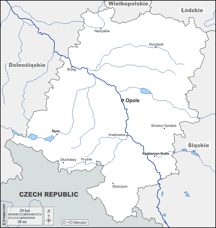 d-maps > 欧洲 > 波兰 > 奧波萊省 > 边界, 水文学, 主要城市, 名称