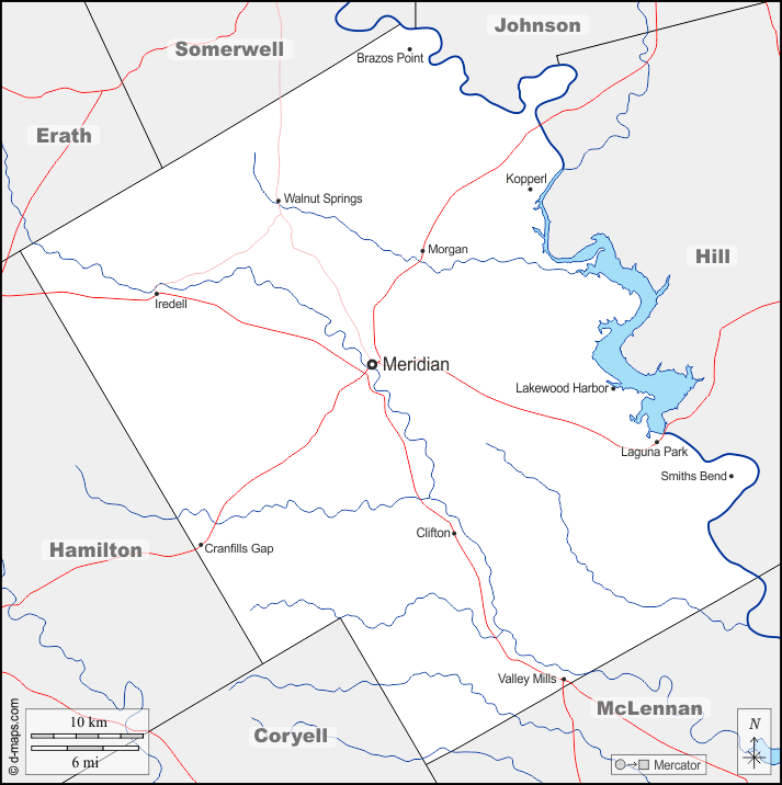 Brazos Point, Clifton, Cranfills Gap, Iredell, Kopperl, Laguna Park, Lakewood Harbor, Meridian, Morgan, Smiths Bend, Valley Mills, Walnut Springs.