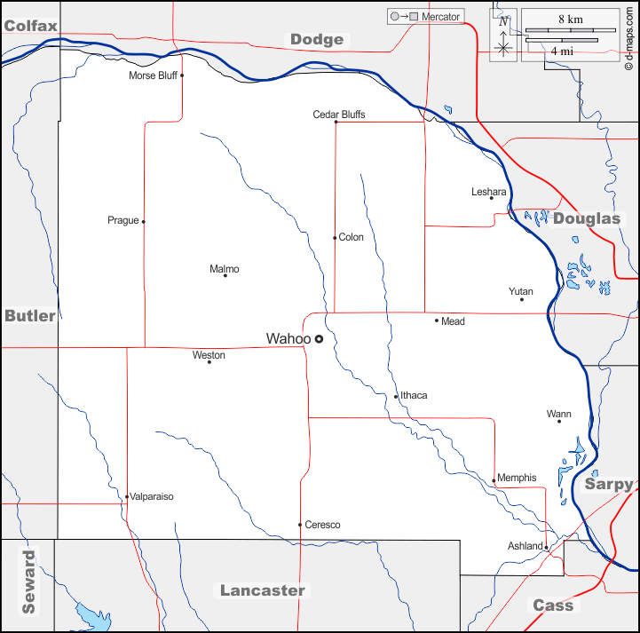 Ashland, Cedar Bluffs, Ceresco, Colon, Ithaca, Leshara, Malmo, Mead, Memphis, Morse Bluff, Prague, Valparaiso, Wahoo, Wann, Weston, Yutan.