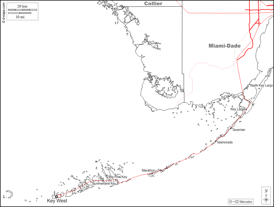 d-maps > 美国 > 佛罗里达州 > 梦露县 > 边界, 主要城市, 道路, 名称, 白