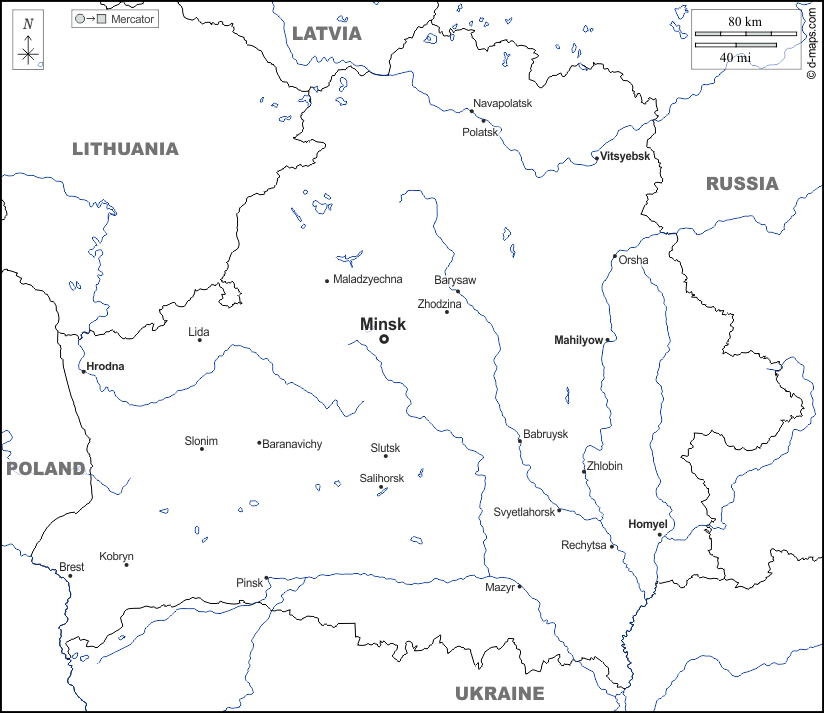 d-maps > 欧洲 > 白俄罗斯 > 白俄罗斯 > 边界, 水文学, 主要城市, 名称, 白
