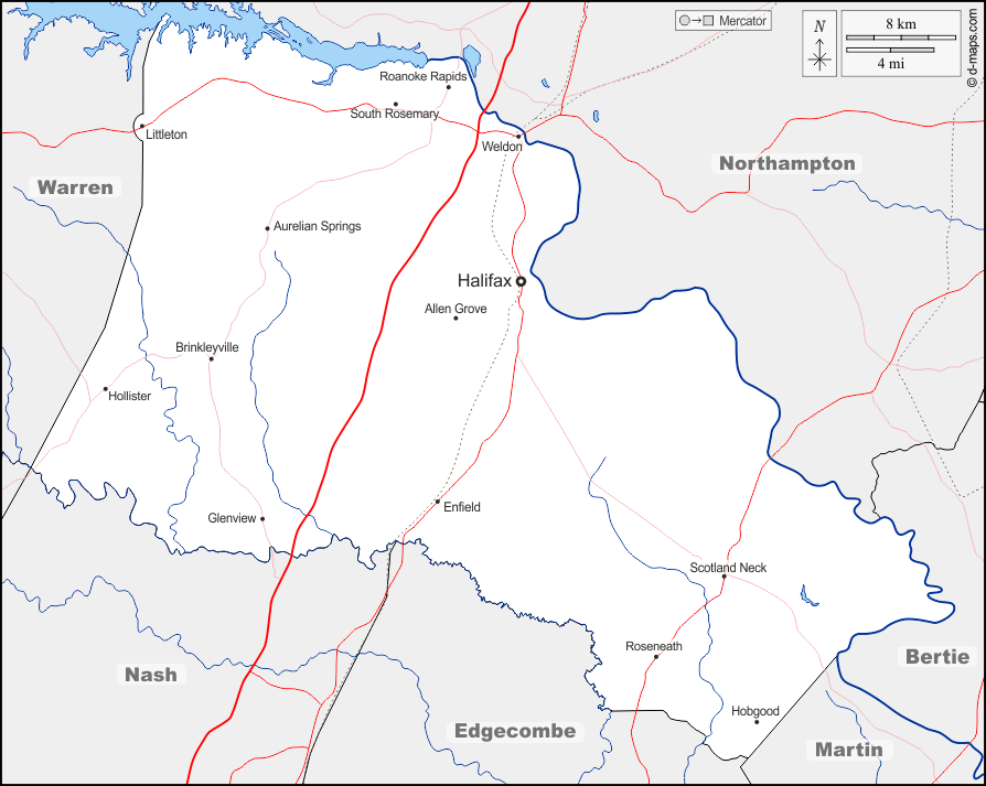 d-maps > 美国 > 北卡罗来纳州 > 哈利法克斯县 > 边界, 水文学, 主要城市, 道路, 名称