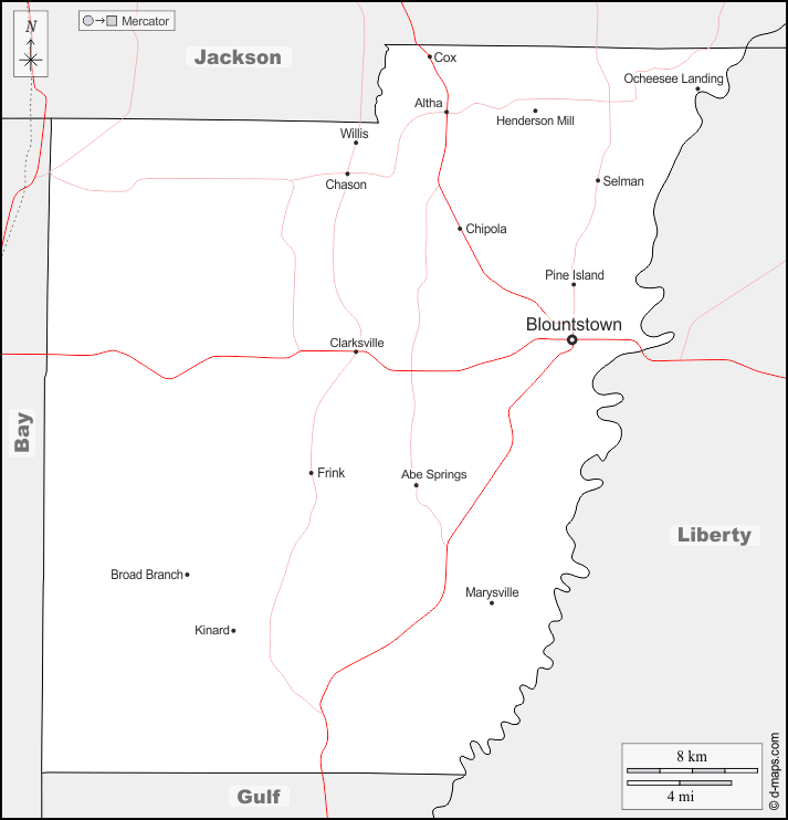 Abe Springs, Altha, Blountstown, Broad Branch, Chason, Chipola, Clarksville, Cox, Frink, Henderson Mill, Kinard, Marysville, Ocheesee Landing, Pine Island, Selman, Willis.