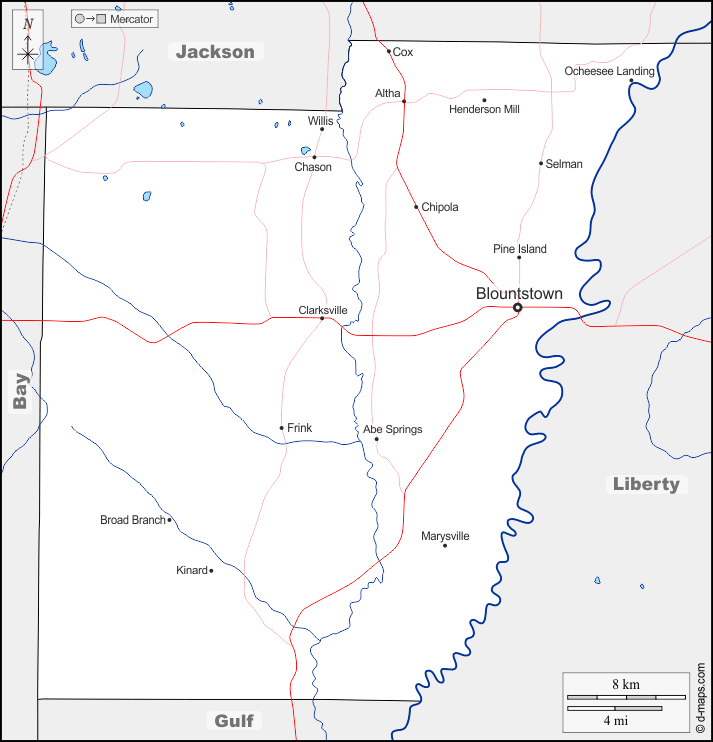 Abe Springs, Altha, Blountstown, Broad Branch, Chason, Chipola, Clarksville, Cox, Frink, Henderson Mill, Kinard, Marysville, Ocheesee Landing, Pine Island, Selman, Willis.