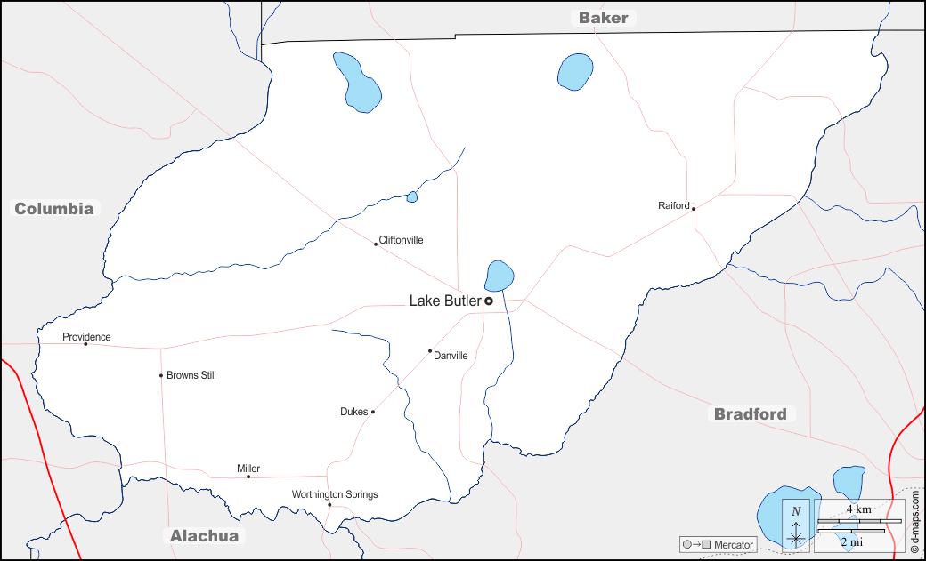 d-maps > 美国 > 佛罗里达州 > 联合县 > 边界, 水文学, 主要城市, 道路, 名称