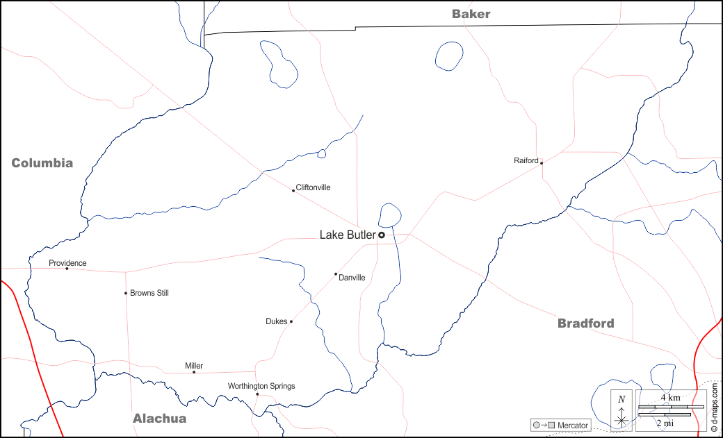 Browns Still, Cliftonville, Danville, Dukes, Lake Butler, Miller, Providence, Raiford, Worthington Springs.