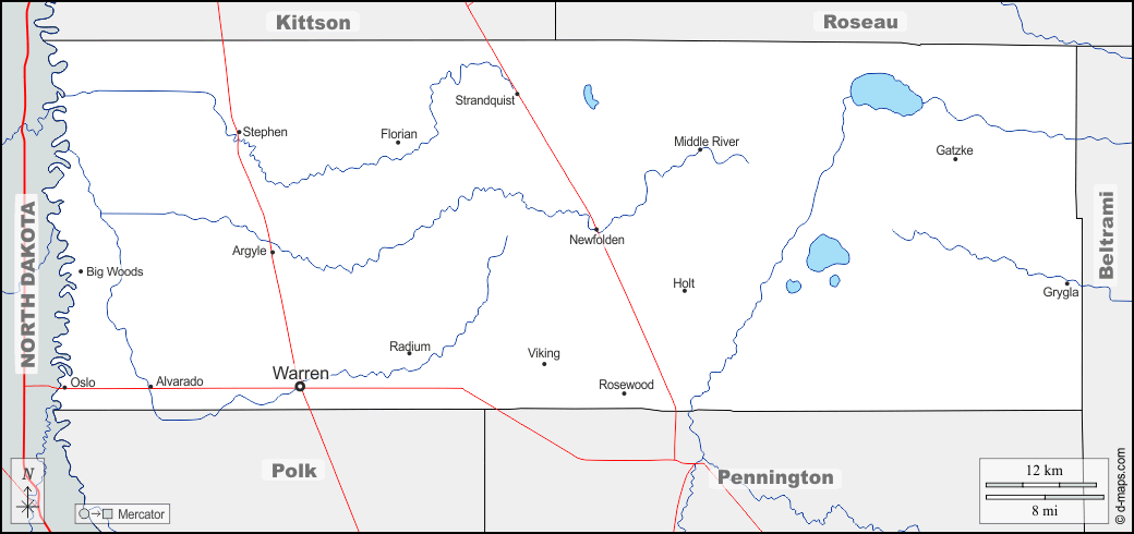 d-maps > 美国 > 明尼蘇達州 > 马歇尔县 > 边界, 水文学, 主要城市, 道路, 名称