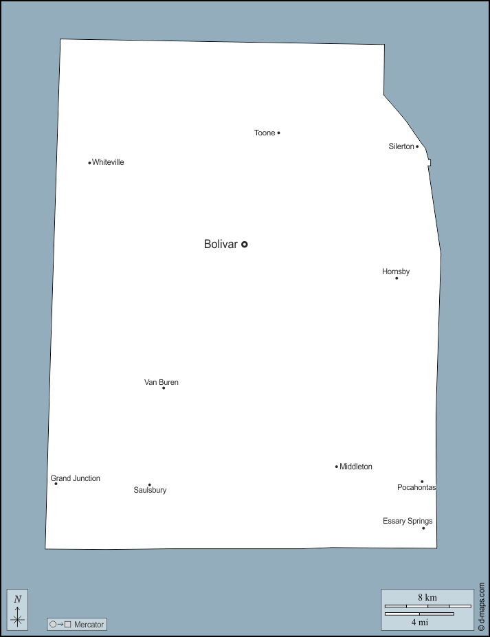 Bolivar, Essary Springs, Grand Junction, Hornsby, Middleton, Pocahontas, Saulsbury, Silerton, Toone, Van Buren, Whiteville.