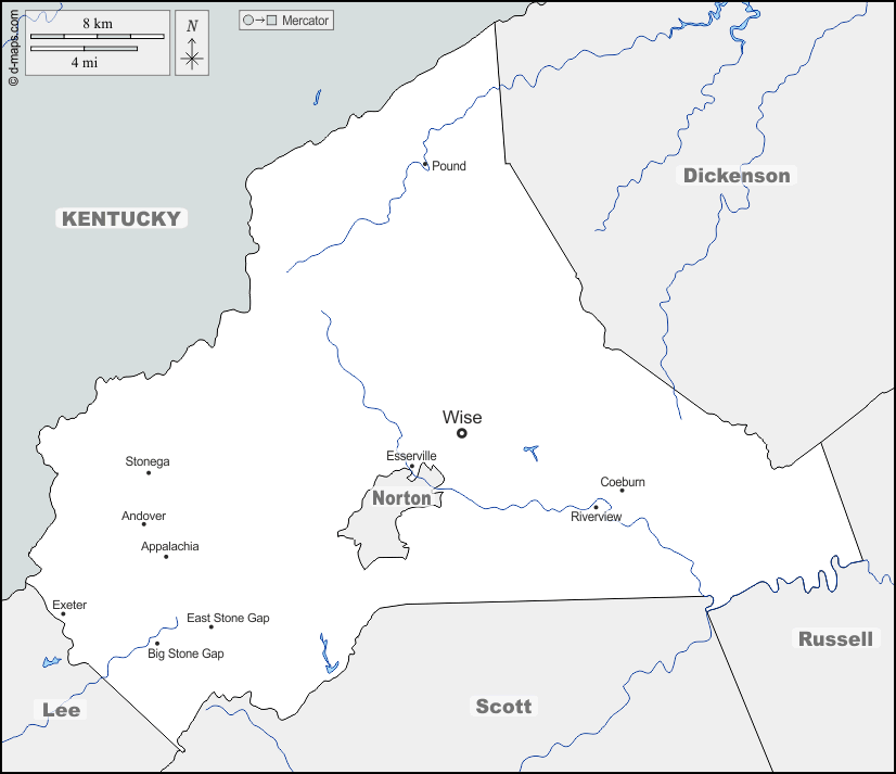 d-maps > 美国 > 弗吉尼亚州 > 怀斯县 > 边界, 水文学, 主要城市, 名称