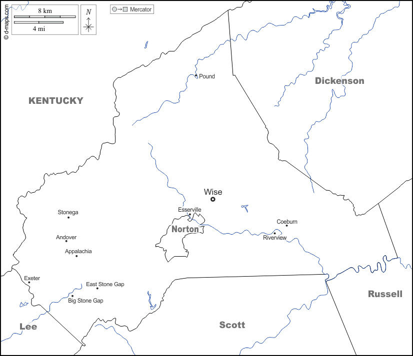 d-maps > 美国 > 弗吉尼亚州 > 怀斯县 > 边界, 水文学, 主要城市, 名称, 白