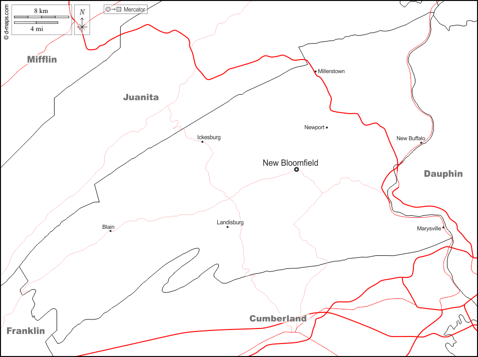 Blain, Ickesburg, Landisburg, Marysville, Millerstown, New Bloomfield, New Buffalo, Newport.