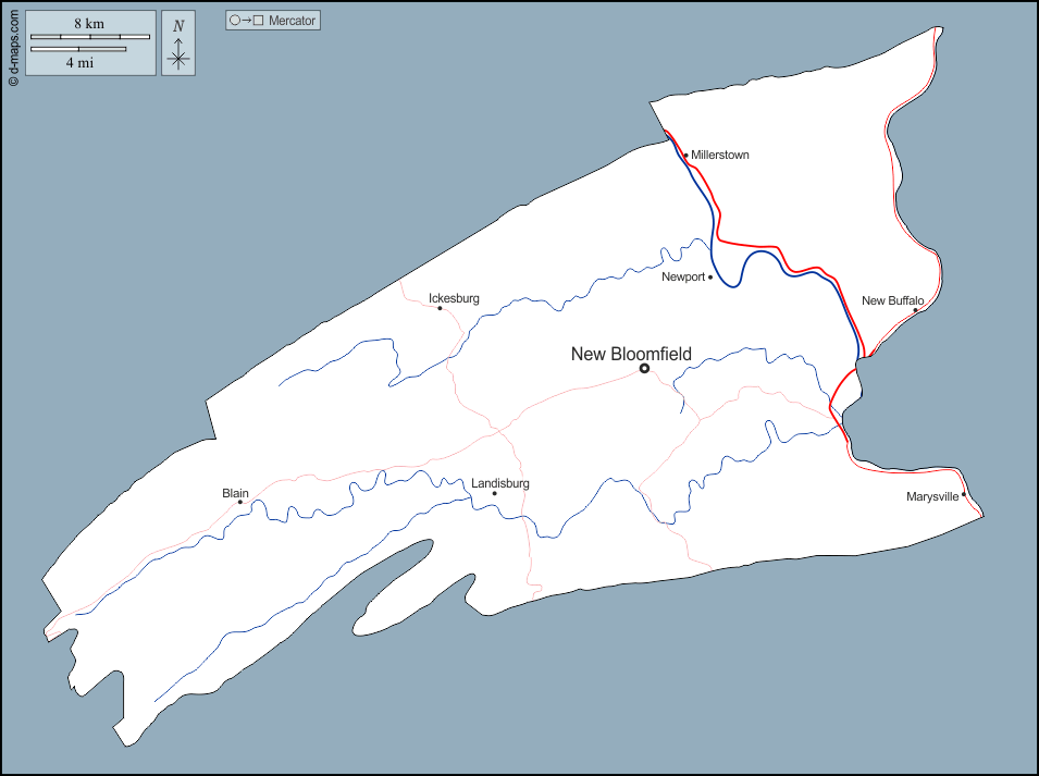 Blain, Ickesburg, Landisburg, Marysville, Millerstown, New Bloomfield, New Buffalo, Newport.