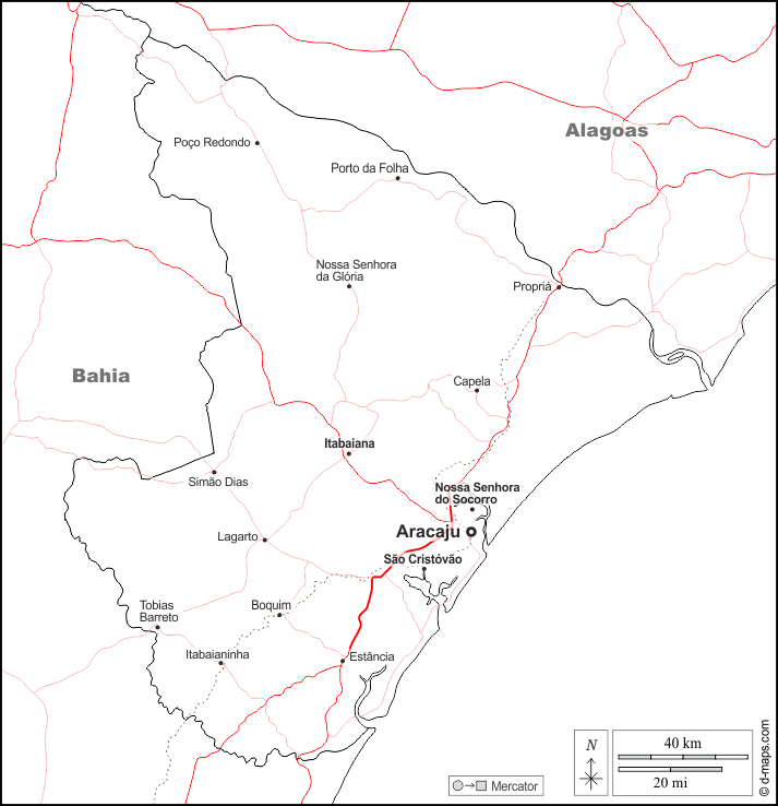 d-maps > 美洲 > 巴西 > 塞尔希培州 > 边界, 主要城市, 道路, 名称, 白