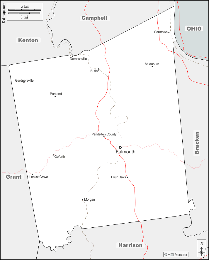 d-maps > 美国 > 肯塔基州 > 彭德尔顿县 > 边界, 主要城市, 道路, 名称