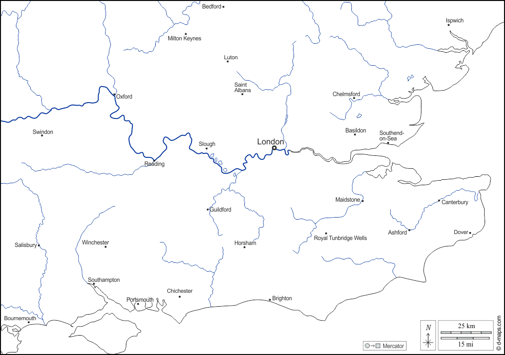 d-maps > 欧洲 > 英国 > 东南英格兰 > 边界, 水文学, 主要城市, 名称, 白