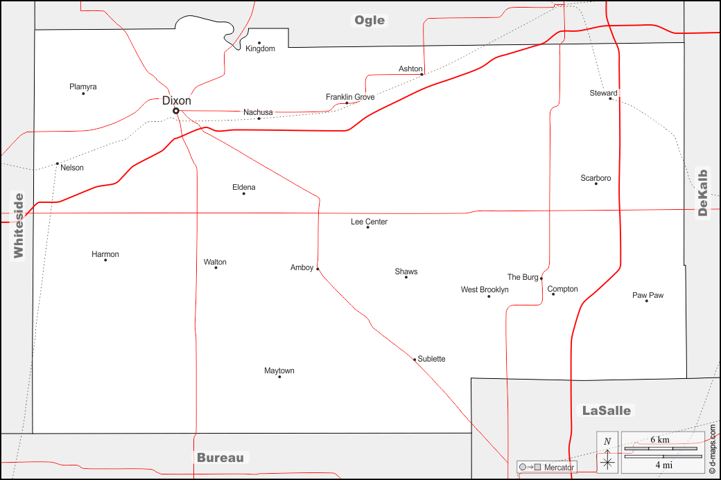 d-maps > 美国 > 伊利诺伊州 > 李县 > 边界, 主要城市, 道路, 名称