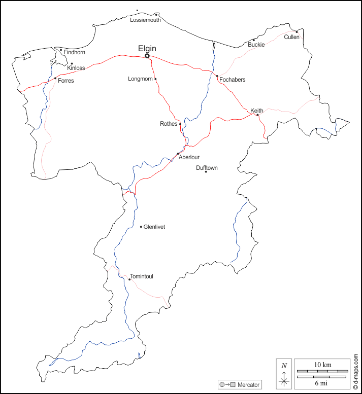 Aberlour, Buckie, Cullen, Dufftown, Elgin, Findhorn, Fochabers, Forres, Glenlivet, Keith, Kinloss, Longmorn, Lossiemouth, Rothes, Tomintoul.