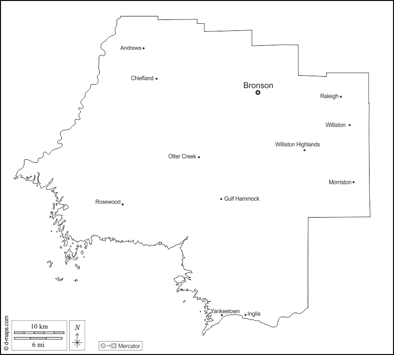Andrews - Bronson - Chiefland - Gulf Hammock - Inglis - Morriston - Otter Creek - Raleigh - Rosewood - Williston - Williston Highlands - Yankeetown