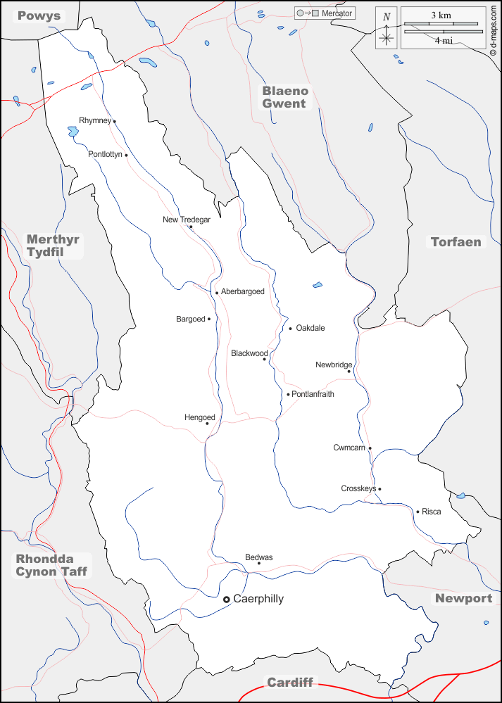 d-maps > 欧洲 > 英国 > 卡菲利 > 边界, 水文学, 主要城市, 道路, 名称