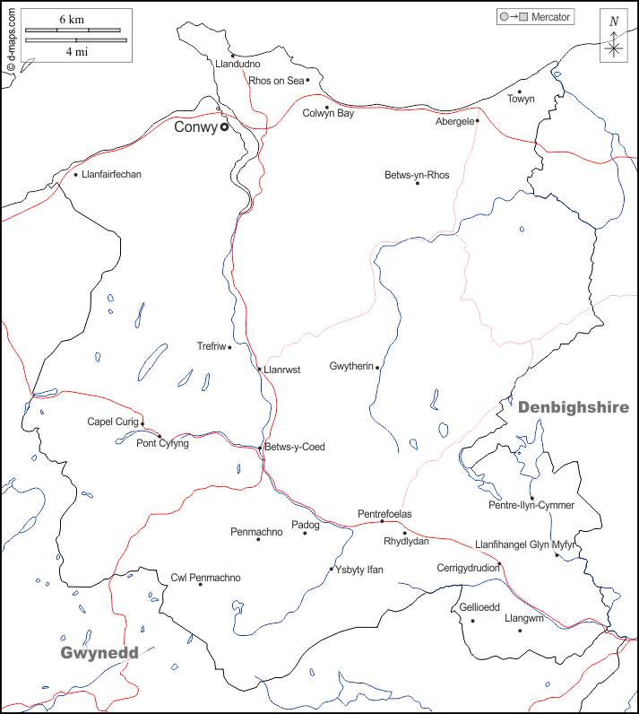 d-maps > 欧洲 > 英国 > 康威 > 边界, 水文学, 主要城市, 道路, 名称, 白