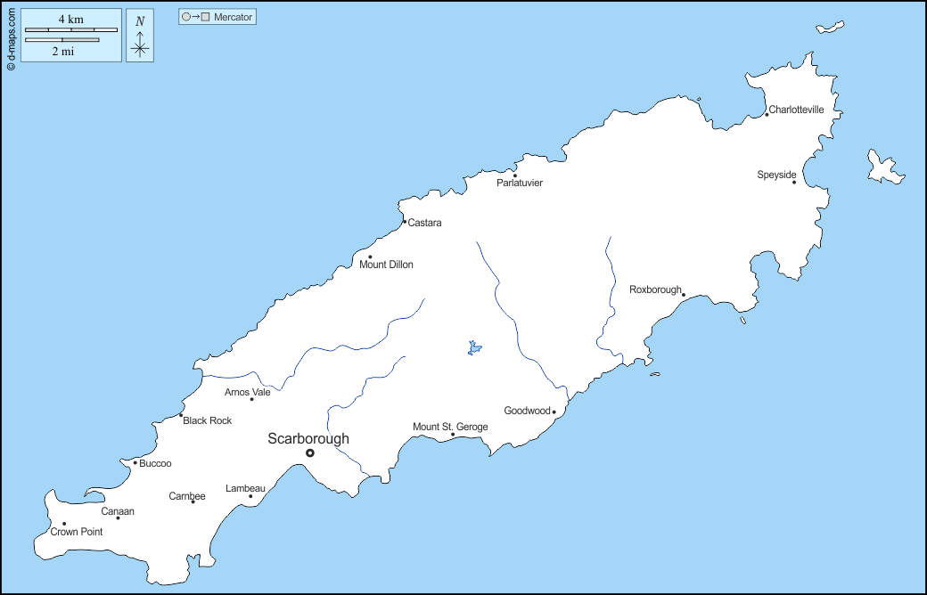 d-maps > 美洲 > 多巴哥岛 > 边界, 水文学, 主要城市, 名称