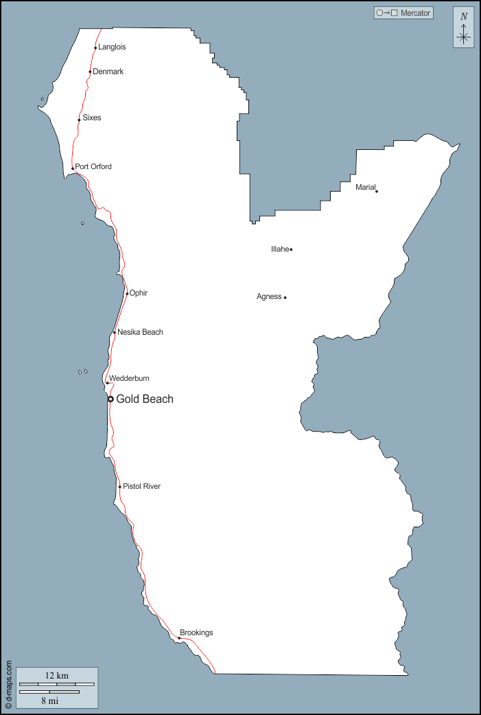 Agness, Brookings, Denmark, Gold Beach, Illahe, Langlois, Marial, Nesika Beach, Ophir, Pistol River, Port Orford, Sixes, Wedderburn.