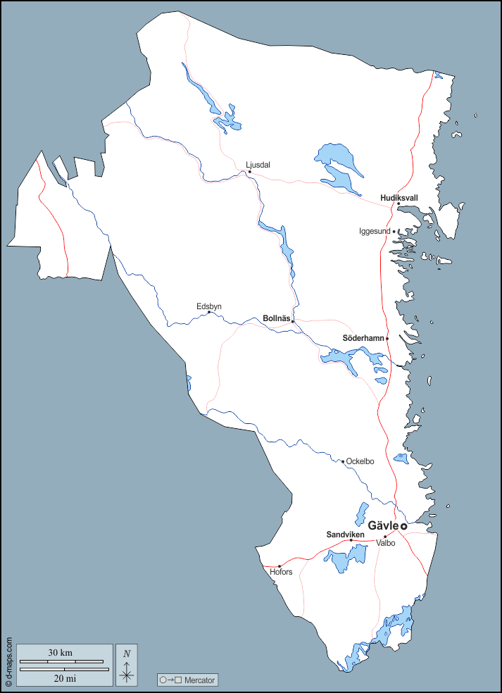 d-maps > 欧洲 > 瑞典 > 耶夫勒堡省 > 大纲, 水文学, 主要城市, 道路, 名称