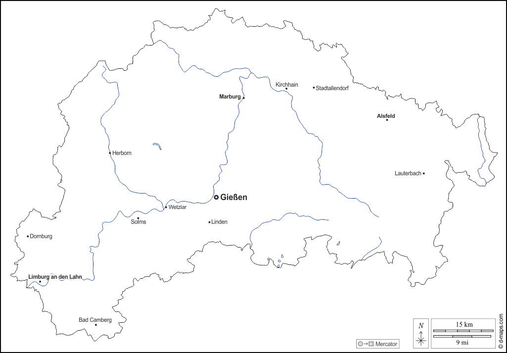 阿尔斯菲尔德、巴特坎贝格、多恩堡、吉森、赫伯恩、基尔海恩、劳特巴赫、林堡、林登、马尔堡、索尔姆斯、施塔伦多夫、韦茨拉尔。