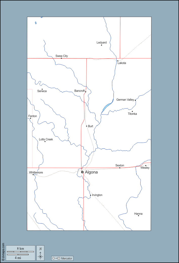 Algona - Bancroft - Burt - Fenton - German Valley - Hanna - Irvington - Lakota - Ledyard - Lotts Creek - Seneca - Sexton - Swea City - Titonka - Wesley - Whittemore