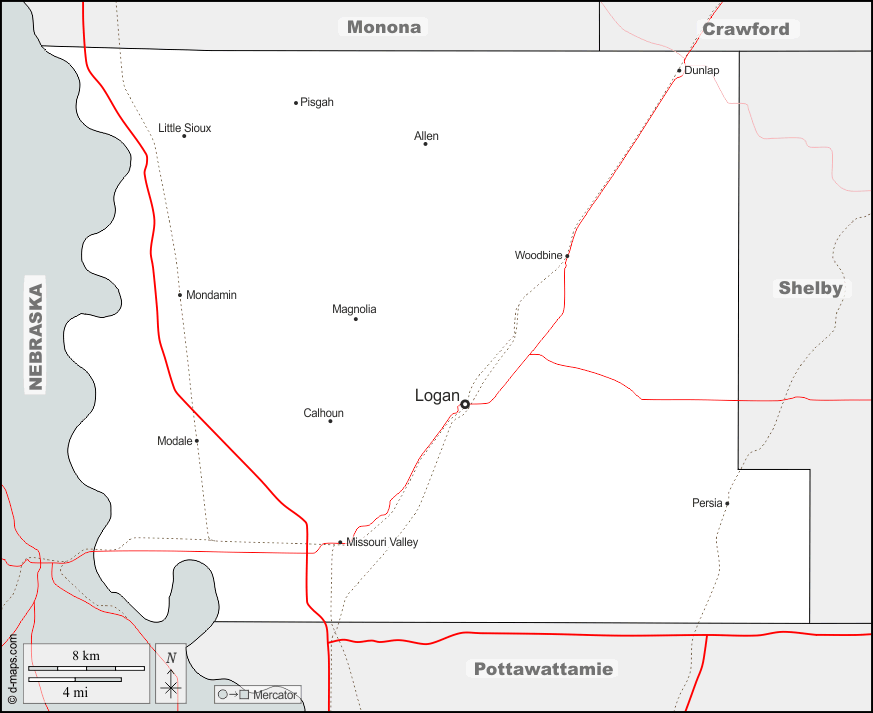 d-maps > 美国 > 艾奥瓦州 > 哈里森县 > 边界, 主要城市, 道路, 名称