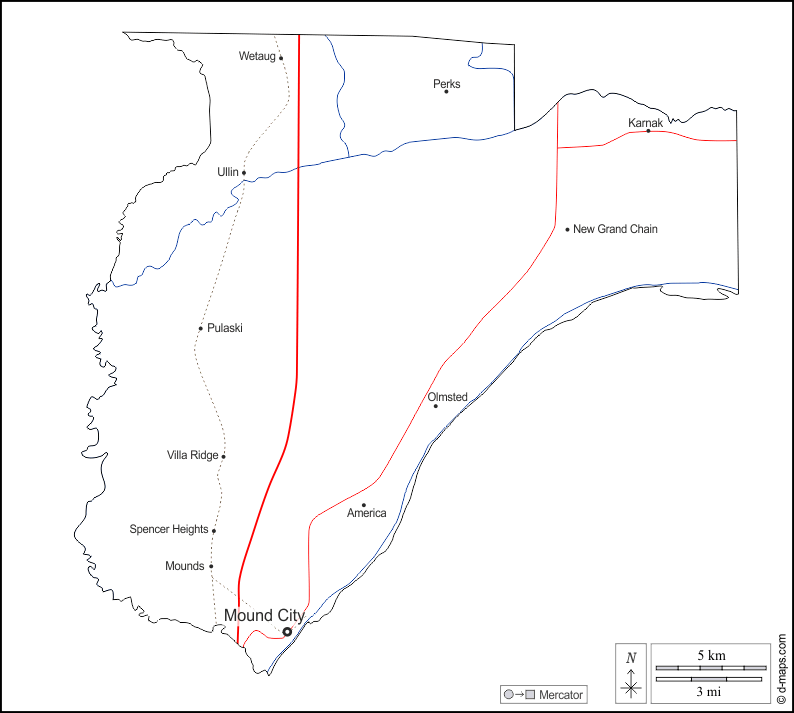 America, Karnak, Mound City, Mounds, New Grand Chain, Olmsted, Perks, Pulaski, Spencer Heights, Ullin, Villa Ridge, Wetaug.