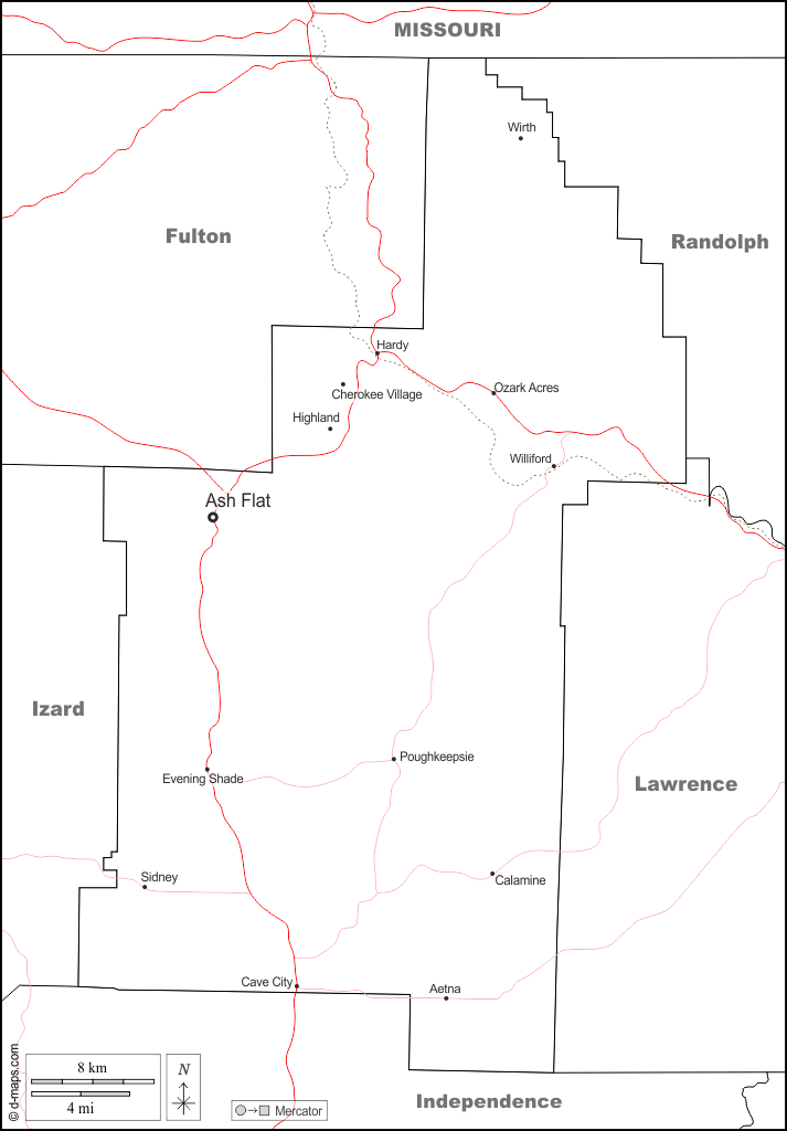 Aetna - Ash Flat - Calamine - Cave City - Cherokee Village - Evening Shade - Hardy - Highland - Ozark Acres - Poughkeepsie - Sidney - Williford - Wirth