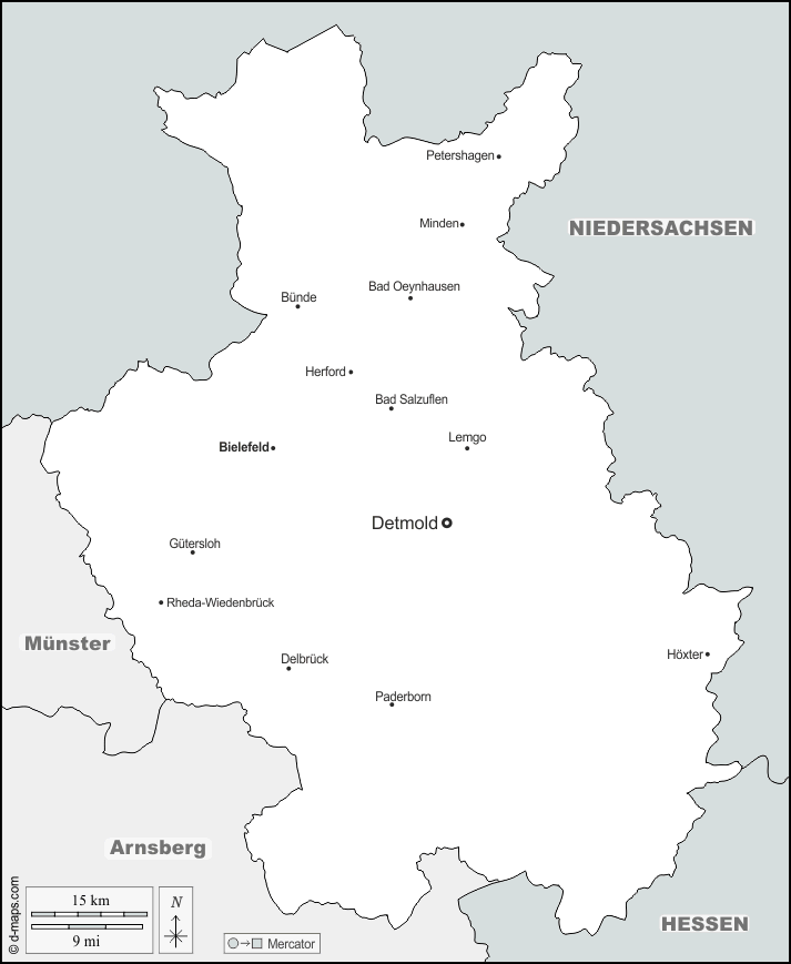巴特奥因豪森、巴特萨尔茨乌夫伦、比勒费尔德、宾德、德尔布吕克、代特莫尔德、居特斯洛、赫尔福德、霍克斯特、莱姆戈、明登、帕德博恩、彼得斯哈根、瑞达-维登布吕克。