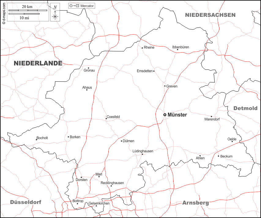 d-maps > 欧洲 > 德国 > 明斯特行政区 > 边界, 主要城市, 道路, 名称, 白