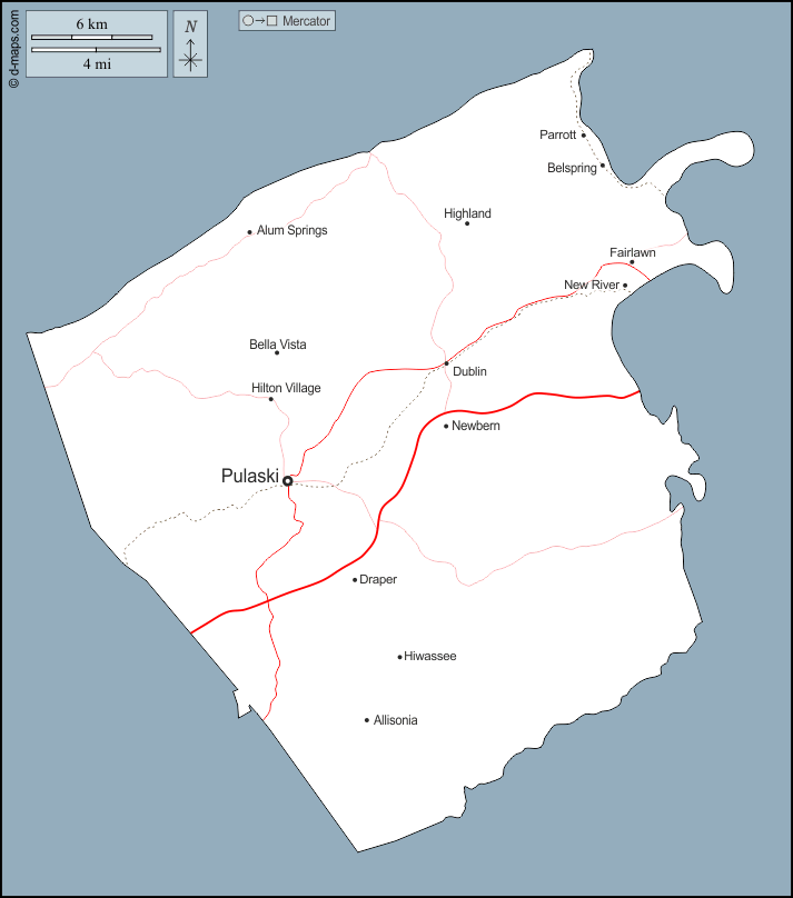 d-maps > 美国 > 弗吉尼亚州 > 普拉斯基县 > 大纲, 主要城市, 道路, 名称