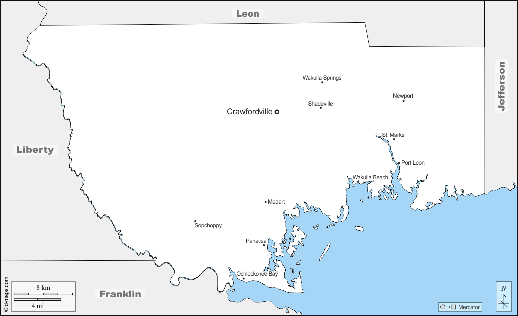 Crawfordville, Medart, Newport, Ochlockonee Bay, Panacea, Port Leon, Shadeville, Sopchoppy, St. Marks, Wakulla Beach, Wakulla Springs.