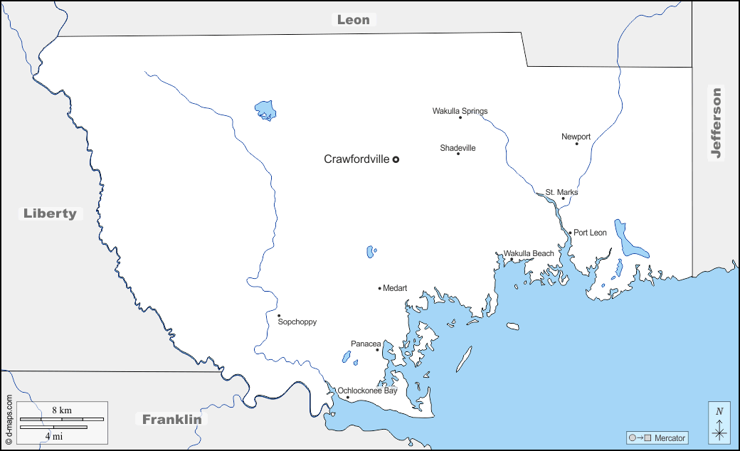 Crawfordville, Medart, Newport, Ochlockonee Bay, Panacea, Port Leon, Shadeville, Sopchoppy, St. Marks, Wakulla Beach, Wakulla Springs.