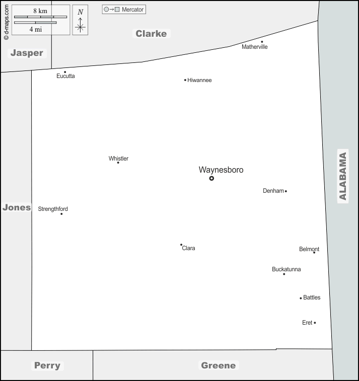 d-maps > 美国 > 密西西比州 > 韦恩县 > 边界, 主要城市, 名称