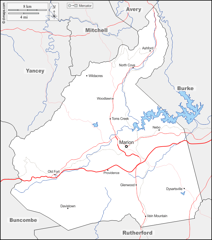 d-maps > 美国 > 北卡罗来纳州 > 麦道威尔郡 > 边界, 水文学, 主要城市, 道路, 名称