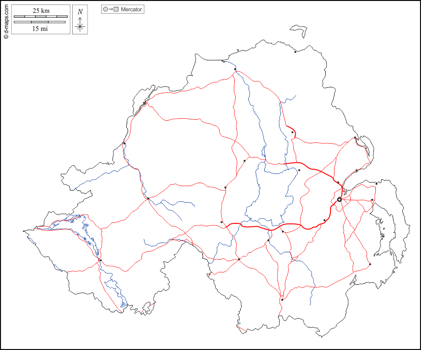 d-maps > 欧洲 > 英国 > 北爱尔兰 > 大纲, 水文学, 主要城市, 道路, 白
