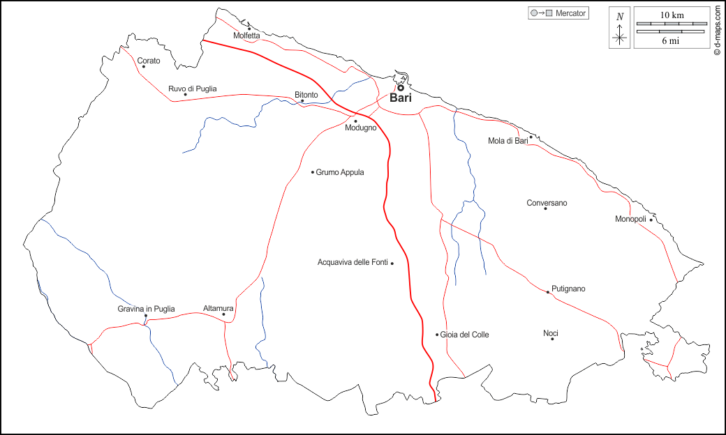 d-maps > 欧洲 > 意大利 > 巴里 > 大纲, 水文学, 主要城市, 道路, 名称, 白