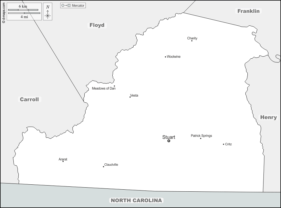 Ararat, Charity, Claudville, Critz, Meadows of Dan, Patrick Springs, Stuart, Vesta, Woolwine.
