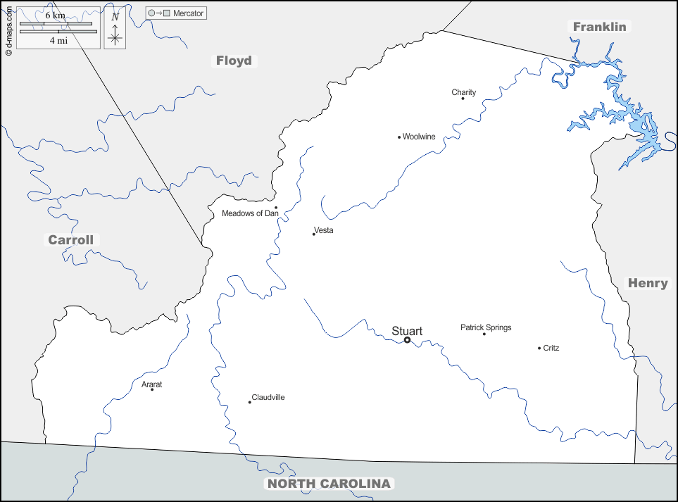 Ararat, Charity, Claudville, Critz, Meadows of Dan, Patrick Springs, Stuart, Vesta, Woolwine.