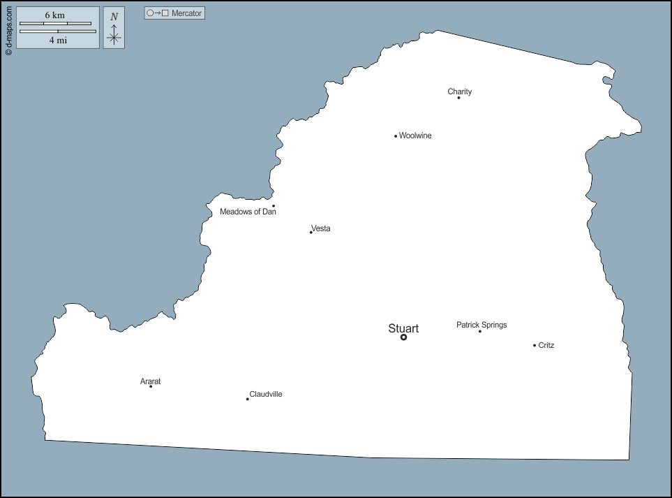 Ararat, Charity, Claudville, Critz, Meadows of Dan, Patrick Springs, Stuart, Vesta, Woolwine.