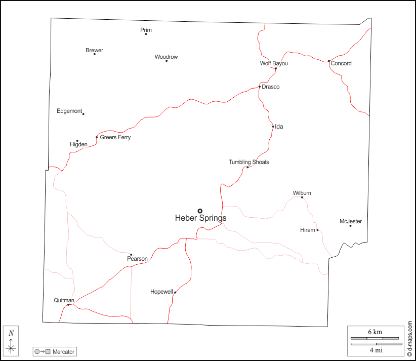Brewer - Concord - Drasco - Edgemont - Greers Ferry - Heber Springs - Higden - Hiram - Hopewell - Ida - McJester - Pearson - Prim - Quitman - Tumbling Shoals - Wilburn - Wolf Bayou - Woodrow