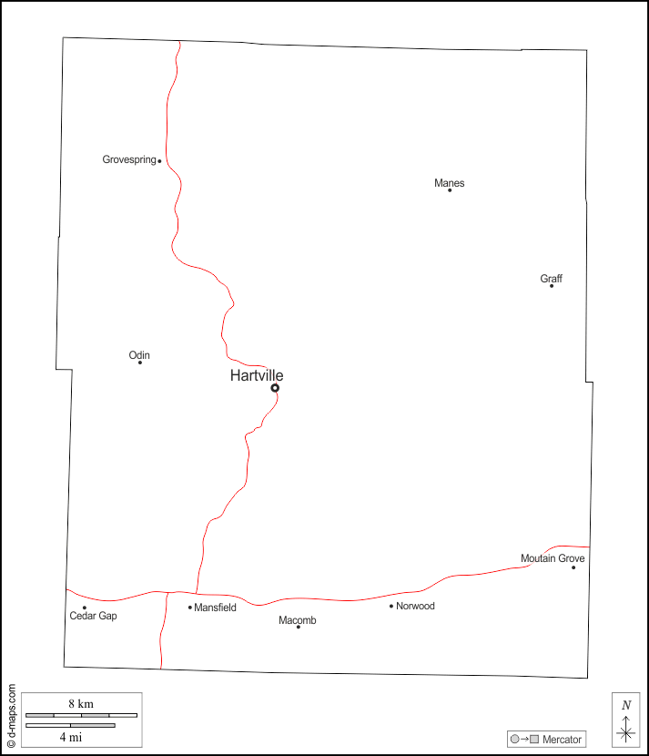 Cedar Gap, Graff, Grovespring, Hartville, Macomb, Manes, Mansfield, Moutain Grove, Norwood, Odin.